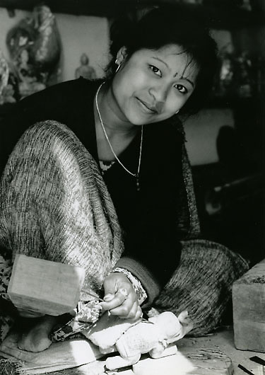 村で工芸品を作る女性。