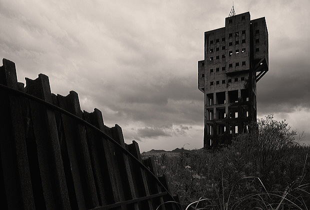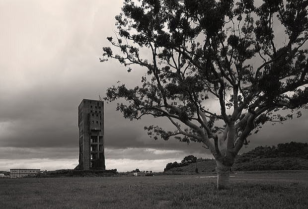 国内で現存する唯一のコンクリート製竪坑櫓。「海軍仕様」で頑丈に作られた櫓は威風堂々と聳え立つ。